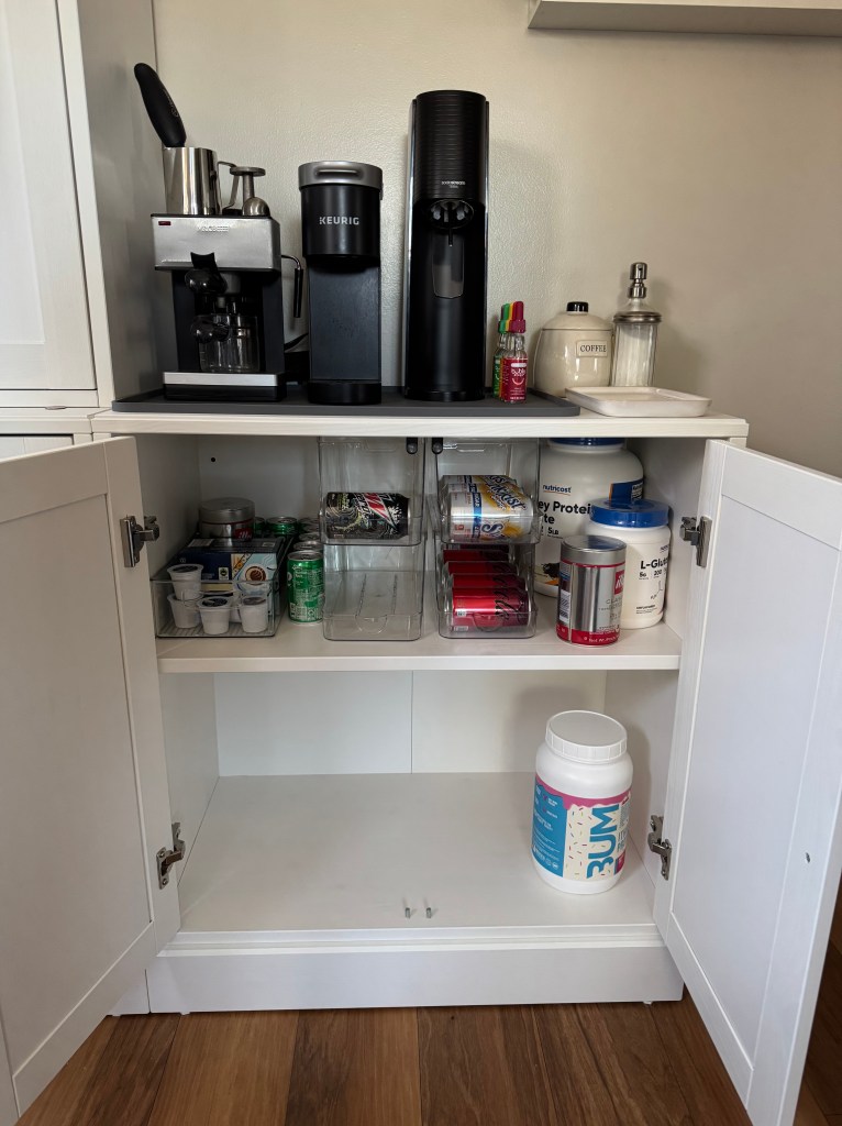 During my brief and unsuccessful jaunt into the world of drinking, I became fixated on adding a bar area next to our pantry cabinet that would also serve as storage for random kitchen appliances that don’t have a space. I once again lost my ability to drink, but I did not lose my bar area fixation. Sobriety pivoted this kitchen addition from an alcohol bar into a coffee bar.