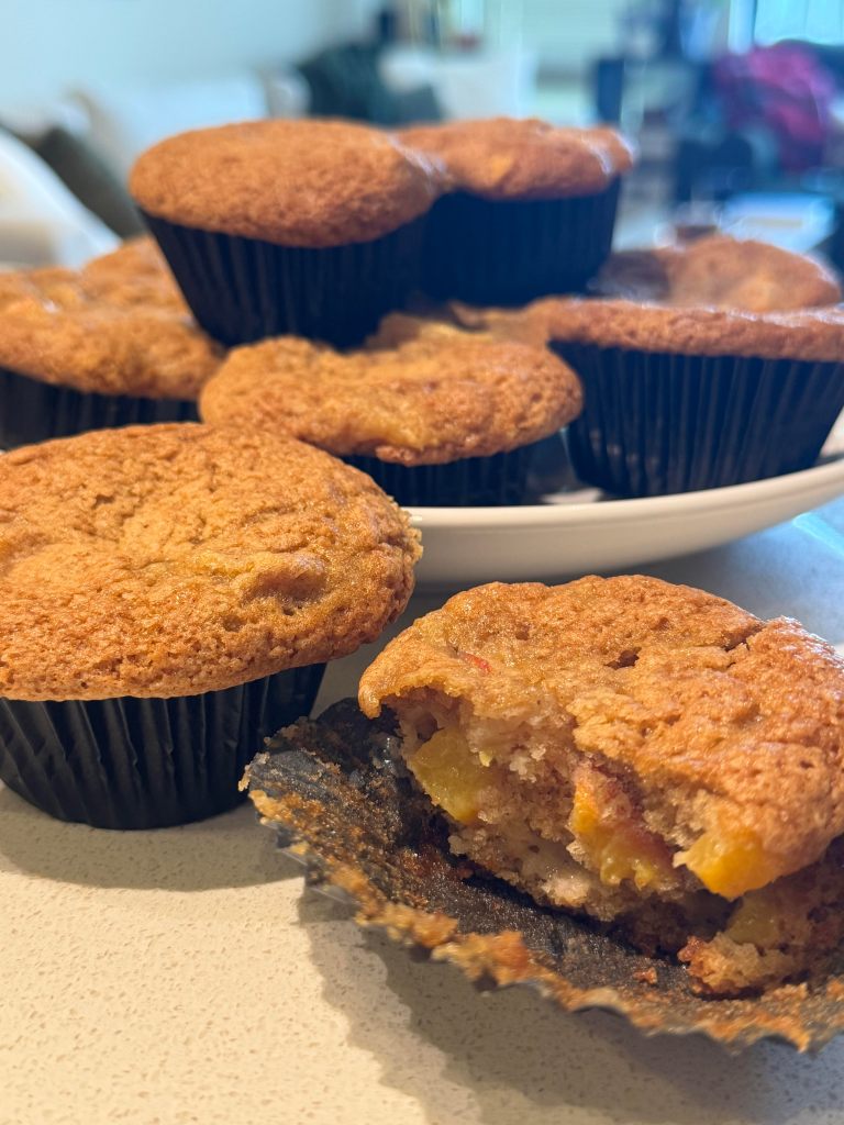 6. Add the 1 1/2 cups (225g) of peaches to the batter and scoop into muffin tin.